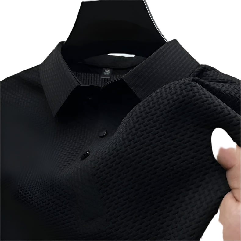 Denna polotröja för herr har en blandning av is-silke, andningsbar ihålig design och en ren krage för en avslappnad affärsstil. De korta ärmarna och den fuktavvisande texturen håller den sval och lätt, vilket gör den idealisk för varma dagar, kontorskläder eller smarta casual-utflykter.
