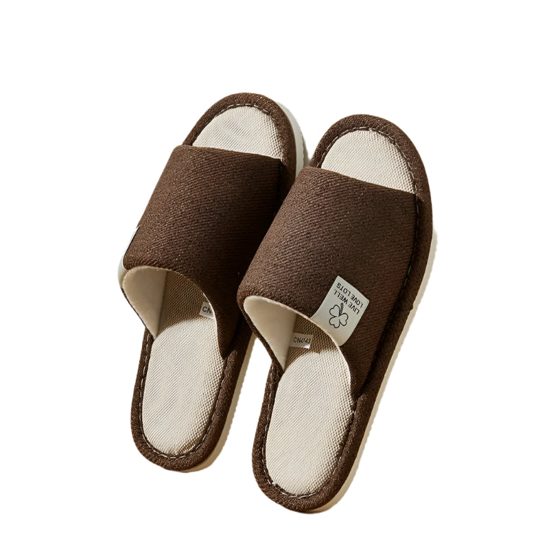 Dessa herrtofflor i linne har en öppen tå och mjuk sula för sval, dämpad komfort hemma. Det lätta, andande materialet håller fötterna torra och bekväma, medan den halkfria sulan garanterar säkra steg på släta ytor.