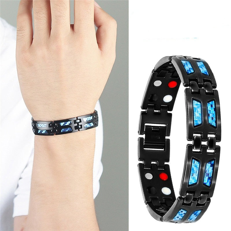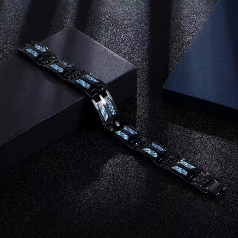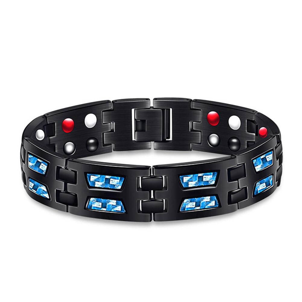 Lyft din look och upplev potentiella hälsofördelar med de inbäddade magneterna och det förstklassiga hantverket i titanstål. Det genomtänkt designade armbandet är inte bara ett fashion statement utan en mångsidig accessoar som ger elegans och charm till alla outfits. Armbandet är belagt med en hållbar svart IP-vakuumplätering som skyddar det mot repor och bibehåller dess eleganta utseende över tid.