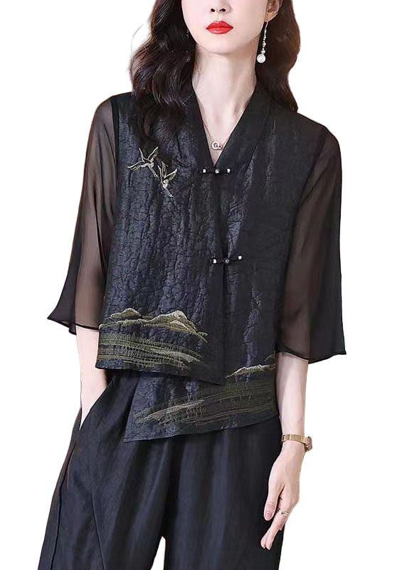 Denna retroblus med V-ringning och kinesiska knappar har en unik stil som framhäver din personlighet. Perfekt för att skapa en iögonfallande look för alla tillfällen.