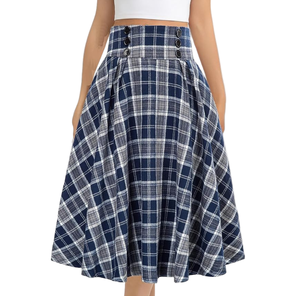 Uppgradera din garderob med denna stiliga högmidjade ternet nederdel. Denna midi-nederdel i A-linje är både elegant och mångsidig, perfekt för olika tillfällen.
