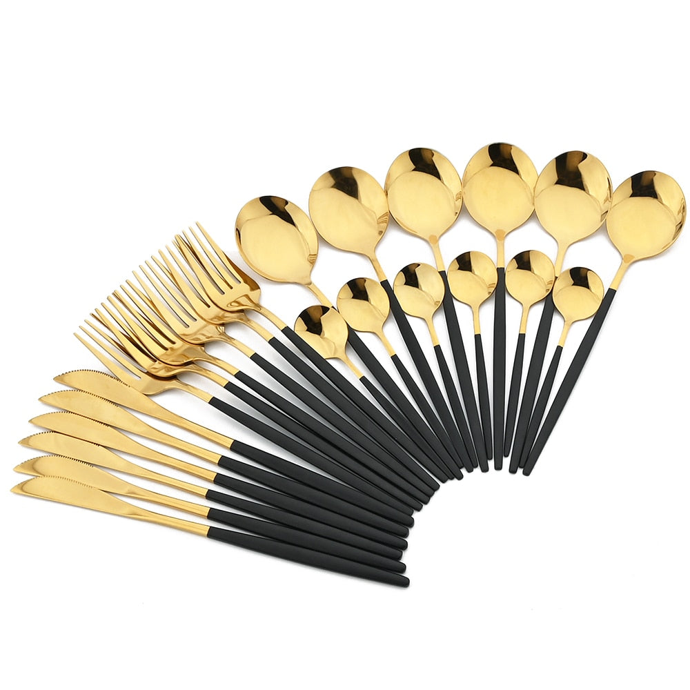 Höj din matupplevelse med det exklusiva Lyxiga Besticksetet! En perfekt blandning av svarta och guldiga accenter som ger en touch av elegans och sofistikation till ditt bord. Tillverkat av premium rostfritt stål, erbjuder detta set enastående hållbarhet, vilket säkerställer långvarig prestanda och motståndskraft mot rost och korrosion.
