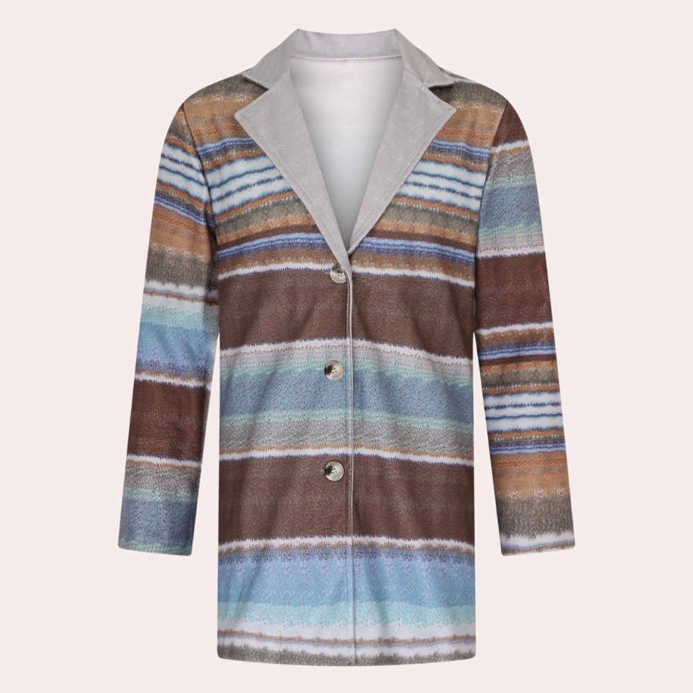 Denna iögonfallande cardigan har ett modernt design med horisontella striber i en rik färgpalett, vilket ger en unik och trendig look. Den långa silhuetten och sjal-kragen gör den till ett mångsidigt plagg som kan stylas på olika sätt, vilket ger en sofistikerad touch till varje outfit.