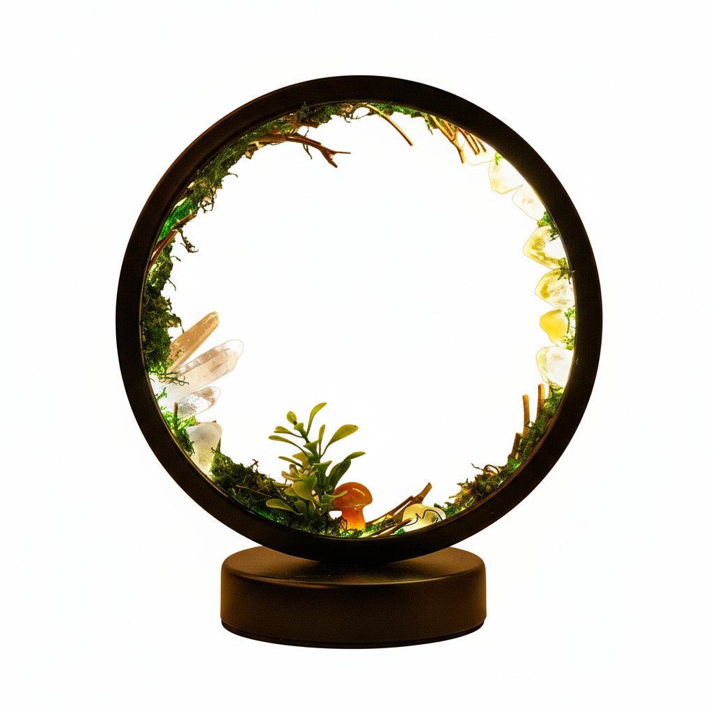 Med sin cirkulära design och vackra detaljer är denna nattlampa en perfekt inredningsdetalj. Den är prydd med verklighetstrogna växter och riktiga kristaller som ger en unik charm till varje rum.