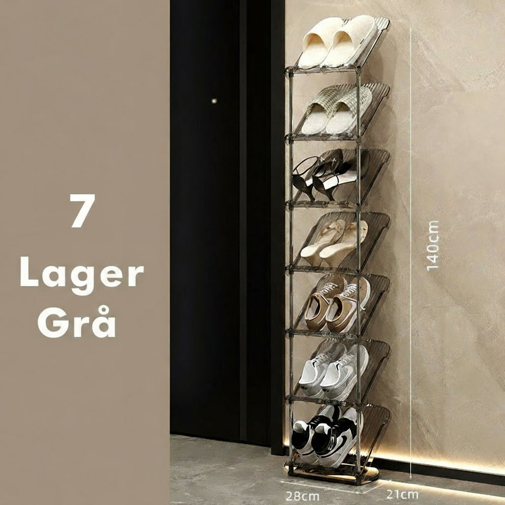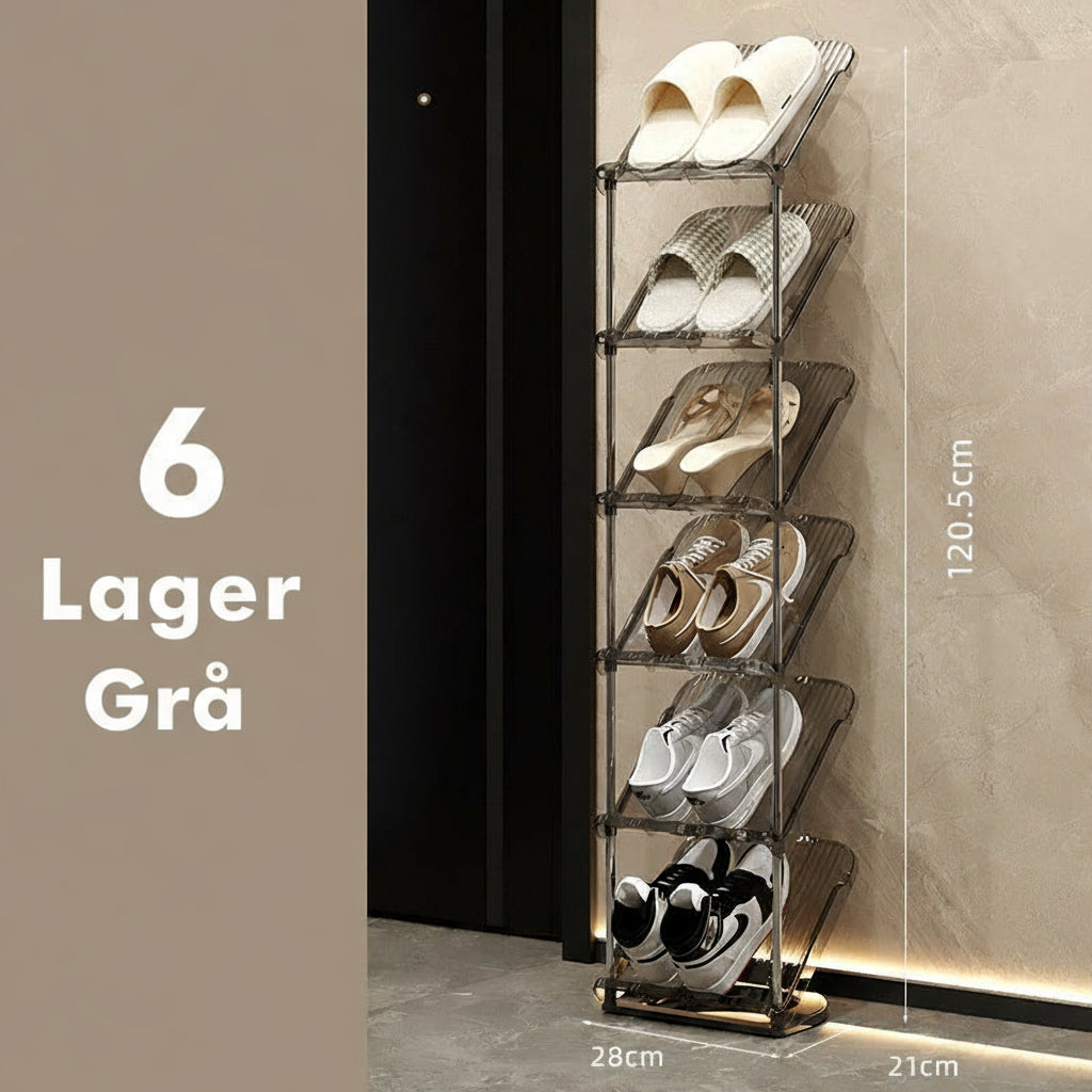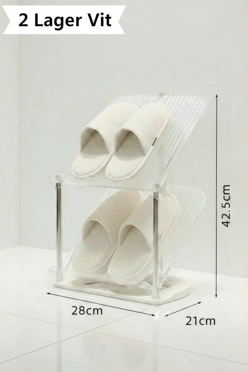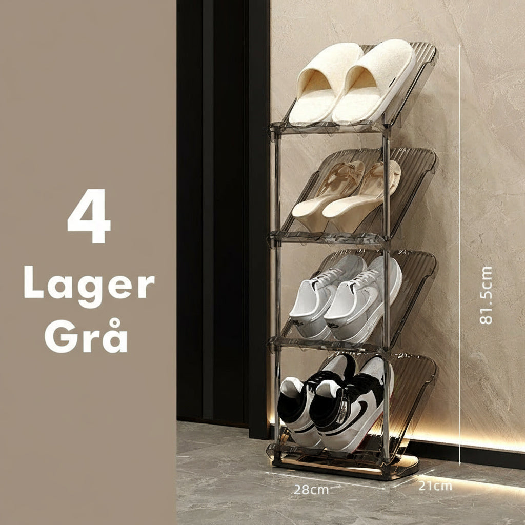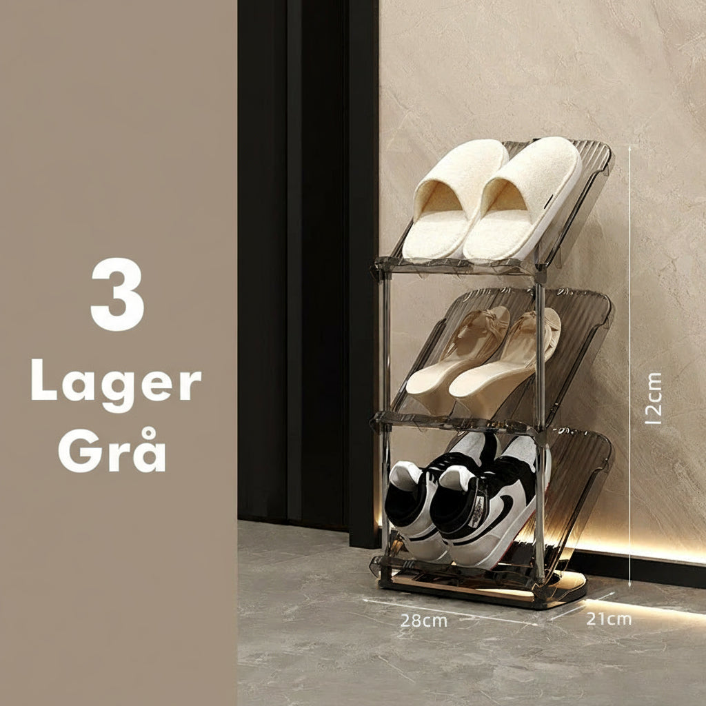 Det transparenta skostället erbjuder en stilren och funktionell lösning för förvaring av skor. Med flera nivåer kan du enkelt organisera sneakers, klackar och stövlar, vilket gör det till ett utmärkt val för både små och stora utrymmen.