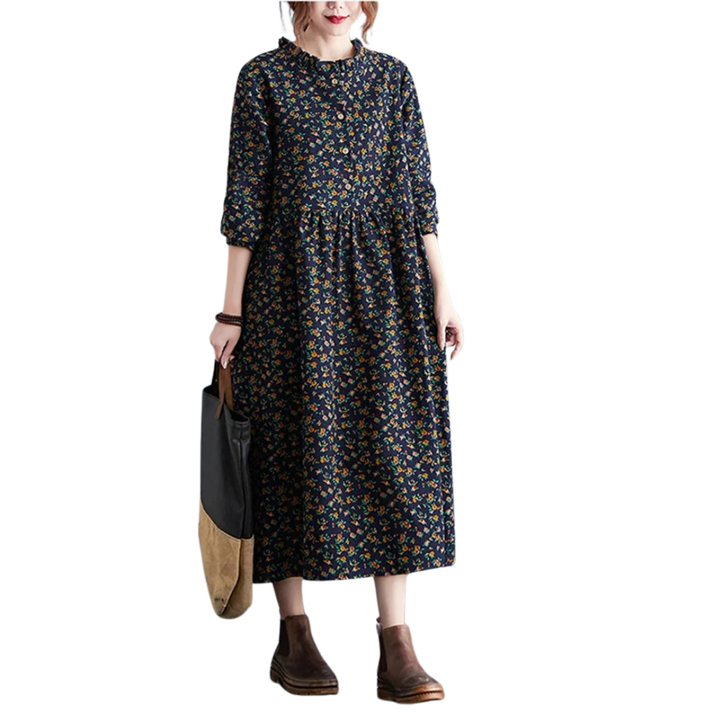 Skapa en tidlös stil med vår Vintage blommig volangklänning för kvinnor. Den här långärmade klänningen är tillverkad av mjukt bomullslinne och har en unik rynkstruktur och ett fint blommönster som ger din garderob en fräsch, naturlig charm. Den lösa, bekväma passformen ger komfort hela dagen, vilket gör den perfekt för avslappnade utflykter eller mysiga helgplaner.