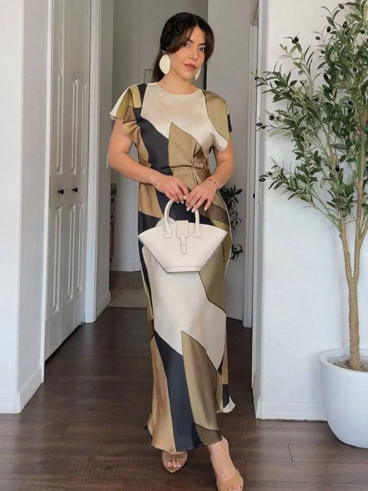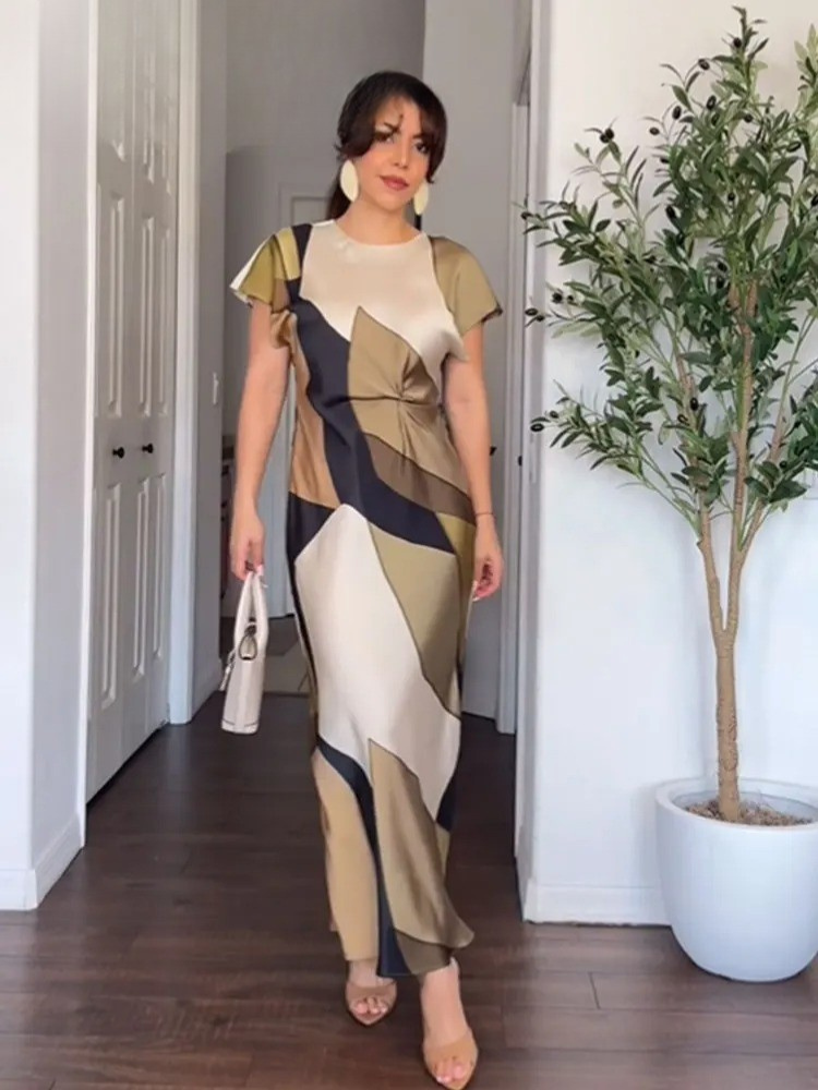 Denna vintageinspirerade långklänning har ett heltäckande tryck, korta ärmar och en mjukt veckad kjol som faller vackert. Den rundade halsringningen och den urringade ryggen ger en modern touch till den klassiska formen, medan den lösa passformen garanterar komfort hela dagen.