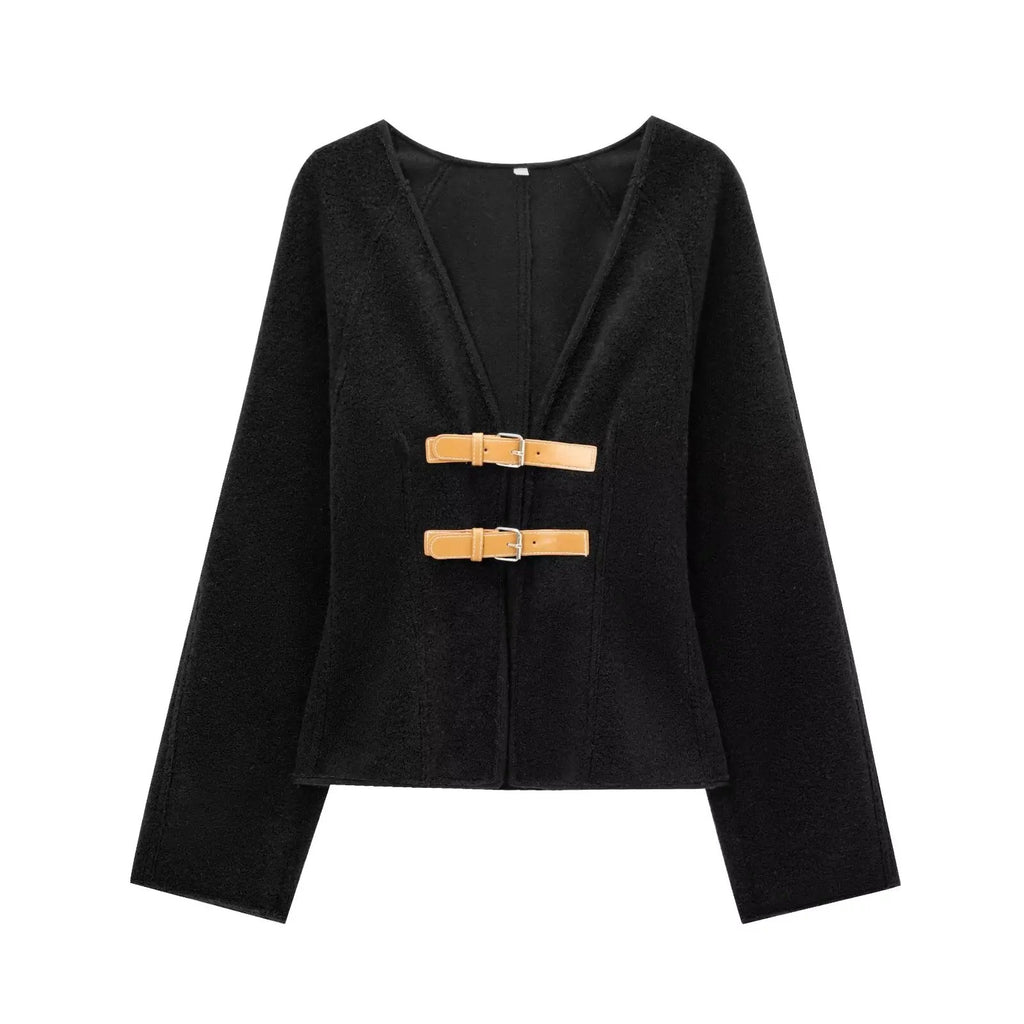Den här jackan är tillverkad av högkvalitativ ull och har unika läderspännen och är perfekt att bära över dina favoritkläder. Oavsett om du är på väg till en avslappnad utflykt eller ett formellt evenemang ser den mångsidiga stilen till att du sticker ut vart du än går.