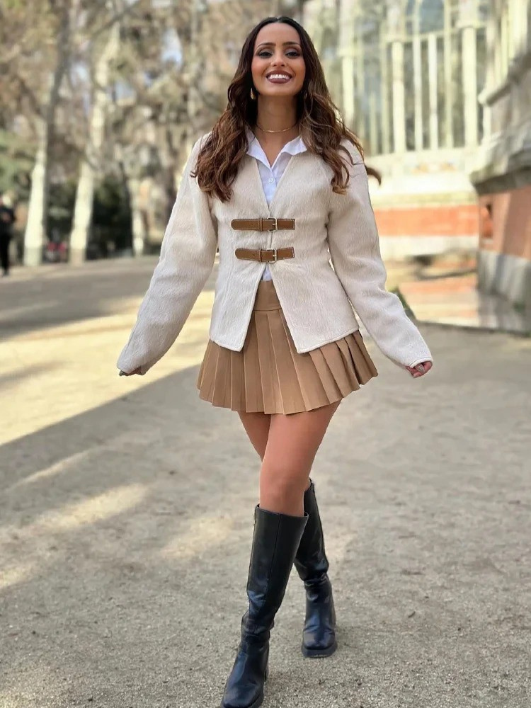 Svep in dig i sofistikerad stil med vår Vintage ulljacka med läderspänne för kvinnor. Denna kappa är designad för att hålla dig varm samtidigt som du gör ett statement och har en skräddarsydd passform och en enkelknäppt design som enkelt blandar vintage charm med modern funktionalitet.
